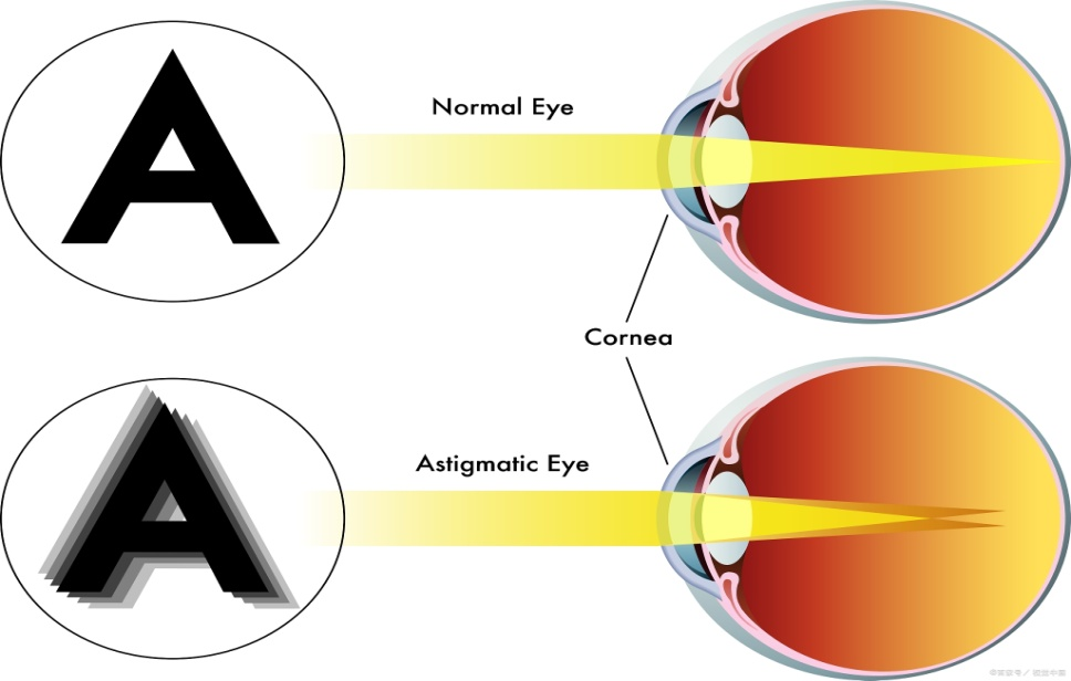 角膜散光绝大多数是由于先天发育不良形成的,有一定的遗传倾向,即眼球先天发育不够圆,导致角膜表面不同方向的弯曲度不一致,造成不同方向子午线的屈光率不一致,使得外来光线不能聚集于同一焦点,于是光线便不能准确地聚焦在视网膜上形成清晰的物像,会导致人们在近距离或远距离看物体时出现模糊或扭曲的视觉问题,这种情况便称为角膜散光。